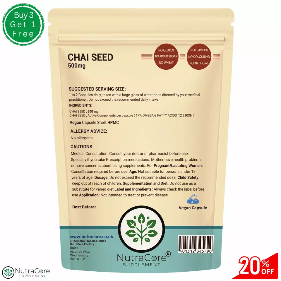CHAI SEED, Active Components per capsule ( 17% OMEGA-3 FATTY ACIDS, 12% IRON)