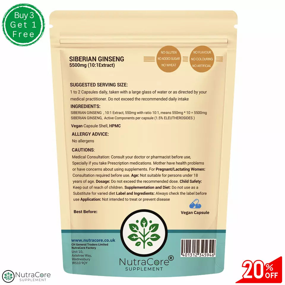 Siberian Ginseng Extract is used to help increase energy, longevity, and vitality. It is widely used in Russia as substance that helps with Mental Health or Physical Stress Health